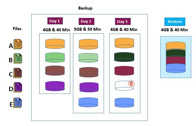 • When you run the backup on Day 3, it’ll backup 4 files again (D is removed – remember?) and it’ll take you 40 mins.