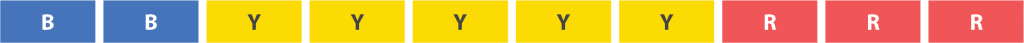 We’re using colored blocks, but pretend they are strings. The Blue strings labeled B are all identical. Similarly, the yellow strings labeled Y are all identical. And the red strings labeled R are all identical.